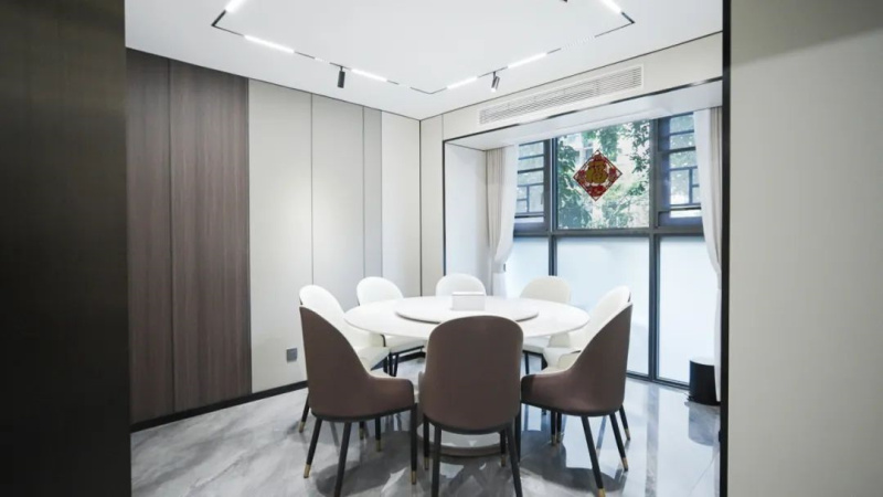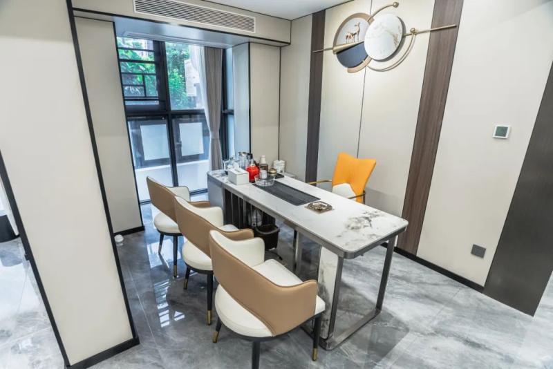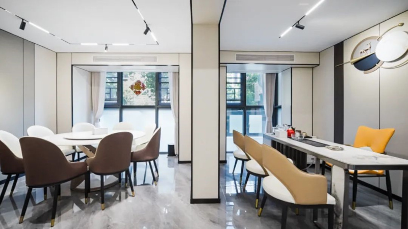 开放式餐厨区一体化,保持区域动线顺畅的功能性,同时也能增进日常交流的互动感。餐厨区用半墙隔断区分功能区,地面铺贴冠珠卡塔尔岩板打造视觉延伸感,厨房、餐厅、茶室三个空间,彼此相连却又界限明朗,即可满足日常人间烟火,也可满足偶尔到来的客人招待需求。